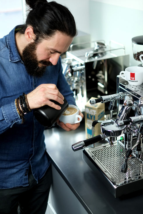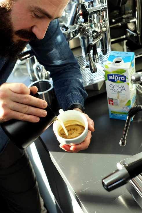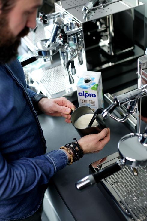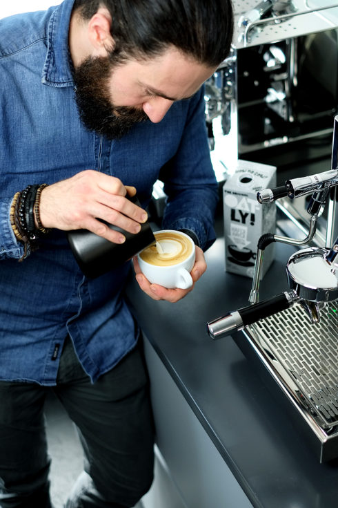Als Standard für perfekten Milchschaum wird bei Barista Wettbewerben meist pasteurisierte Frischmilch mit einem hohen Fettgehalt gewählt. Die Frischmilch wird mit heißem Wasserdampf aufgeschäumt und darf dabei nicht die 65 Grad Celsius überschreiten. Ist nach der Roll- und Ziehphase der perfekte Schaum entstanden, liegt die nächste Herausforderung darin, sich mit dem Milchschaum künstlerisch zu betätigen und schöne Muster und Figuren –die Latte-Art– auf den Kaffee zu zaubern. Wir haben unseren Barista Ali gebeten, unsere Pflanzendrinks zu testen und als Latte Art Grundanforderung ein kleines Latte Art Herz auf die Espressi zu zaubern.
